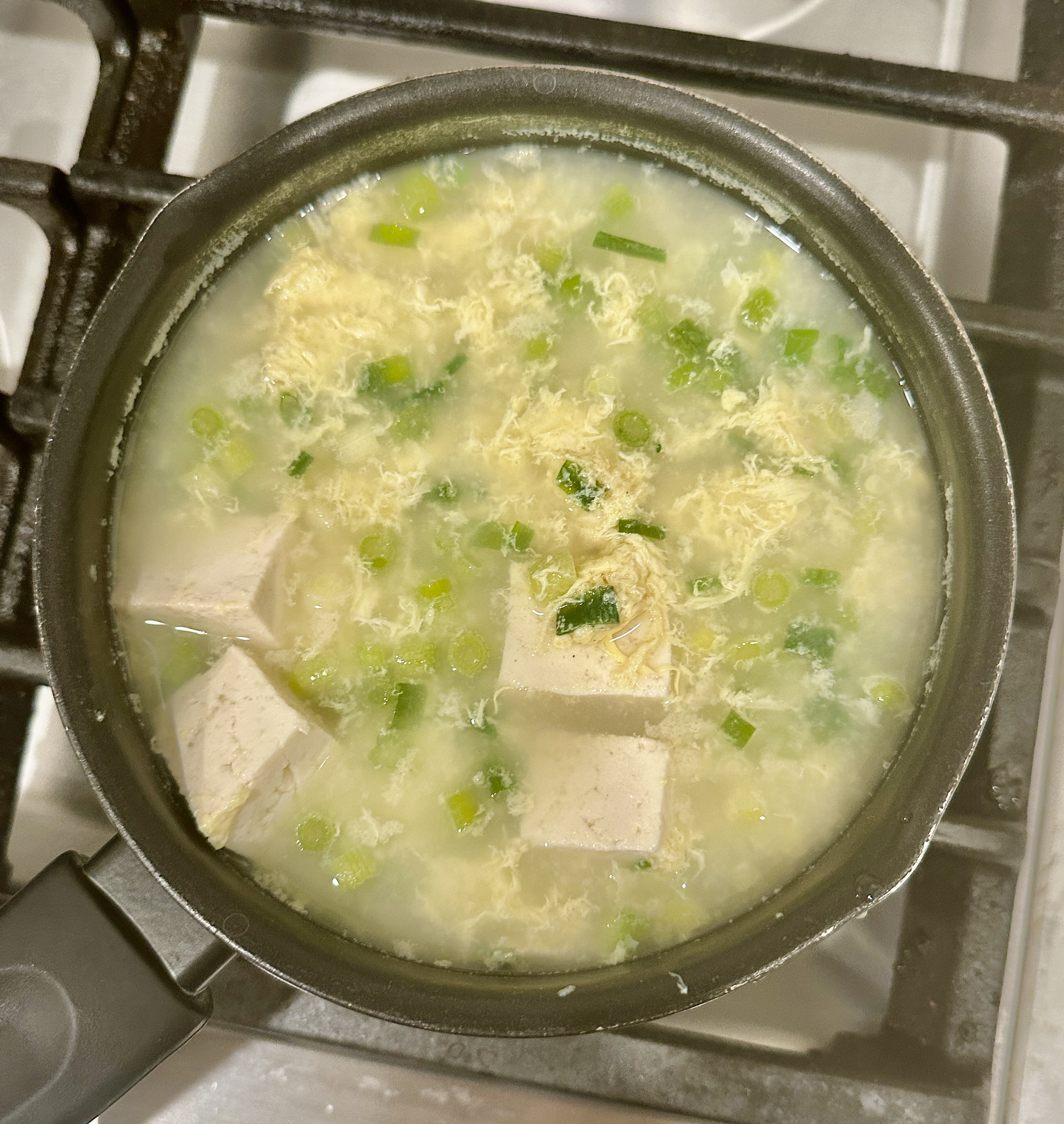 - 물이 끓어오르면 두부를 넣고, 파도 넣고, 계란물을 살짝 원을 그리며 풀어넣어준다.