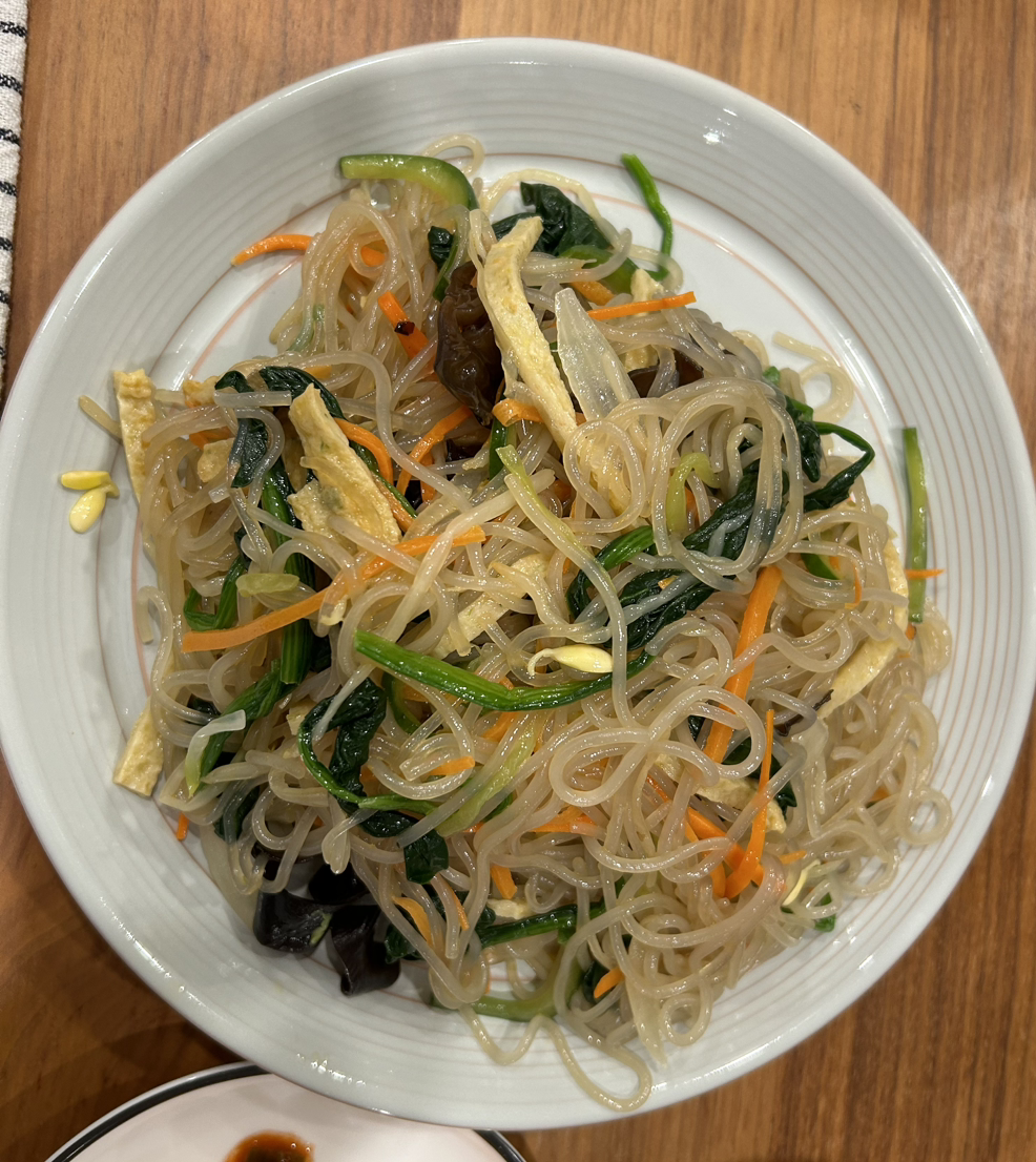 잡채는 한국인이라면 대부분이 좋아하고, 당면을 처음 접하는 외국인들 조차 궁금해하며 맛있게 먹는 음식일 거다. 어릴 때 생일이나 명절이 되면 엄마가 준비하던 요리 중, 내가 제일 좋아했던 것도 잡채였다. 우리 집은 딸만 셋이었는데, 모두 육고기를 좋아하지 않았고, 반대로 아빠는 육식파였다. 특히 돼지고기를 좋아하셨는데, 그래서 엄마는 항상 두 가지 버전을 준비하곤 하셨다. 요즘 말로 하자면 비건 요리를 하나 더 준비하셨던 거. 잡채에 채 썬 돼지고기를 제외한 모든 재료를 넣고 버무리신 다음, 일부를 덜어놓고 돼지고기를 넣어 버무리는 방식이었다. 어릴 때부터 고기가 들어가지 않은 잡채를 먹어서인지, 내가 만드는 잡채에는 고기를 넣지 않는다.